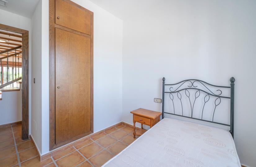 Perfekt innflyttingsklar, med en innbydende hage med parkeringsplass foran og en overbygd veranda med grill bak, som åpner direkte inn i stuen. Første etasje har en koselig stue med peis, et soverom med innebygde garderober, et moderne dusjbad og et separat kjøkken med vaskerom. Ovenpå finner du to ekstra soverom med innebygde garderober – ett med balkong og det andre med privat terrasse – samt et komplett bad. Toppetasjen kan skilte med en romslig solterrasse med åpen utsikt, ideelt for avslapning i solen. Boligen tilbyr et forfriskende svømmebasseng, og selve eiendommen er i utmerket stand, nylig malt og klar for sine nye eiere. Med 3 soverom, 2 bad og totalt 100 m² bygget bolig, kombinerer dette hjemmet komfort og bekvemmelighet i et ettertraktet golfområde.