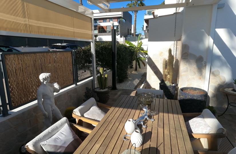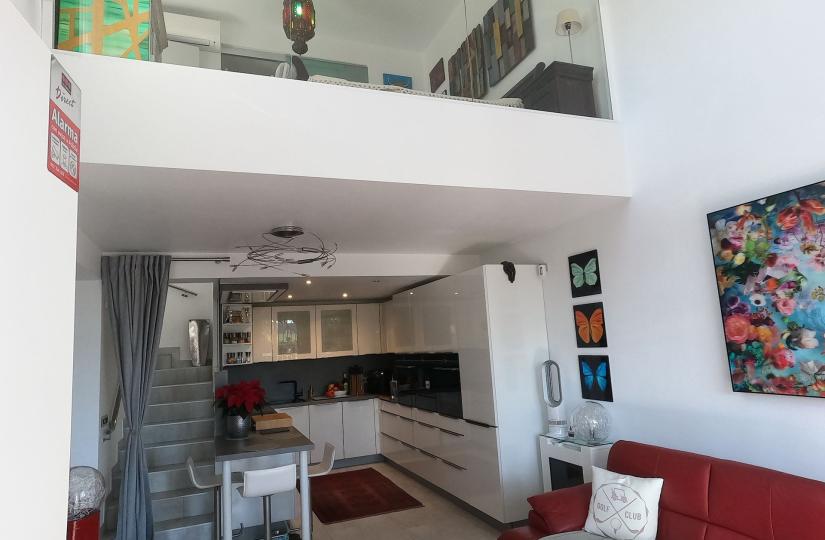 This charming semi-detached villa in Algorfa, located within the sought-after La Finca Golf community, offers a comfortable and peaceful living environment. Spread over 90 m², the home features three spacious bedrooms and two modern bathrooms, with two bedrooms and a bathroom conveniently situated on the ground floor, and the master suite upstairs. The bright, south-facing living area is filled with natural light, creating a warm and welcoming atmosphere throughout the day. A lovely sunroom with glass curtains on the solarium adds extra versatility and space.