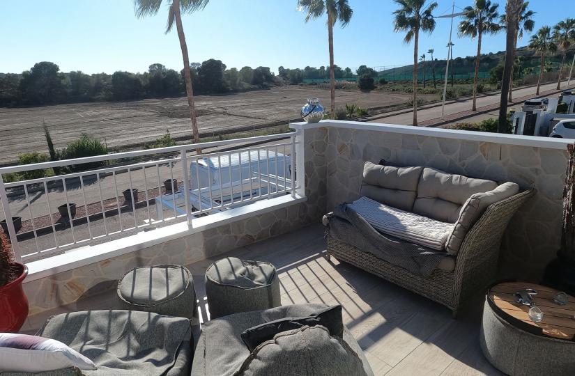 The property is partly furnished, allowing for easy move-in and personalized touches. Step outside to enjoy stunning country views or relax by the large communal swimming pool just steps from the door. Golf lovers will appreciate the beautifully maintained course right at their doorstep, complemented by a tranquil setting with lush landscapes and easy access to local amenities, including shops and restaurants. Recent upgrades include a modern kitchen and bathrooms, new windows, solar panels, and a garden pergola with an electric cover. Additional features include air conditioning in all rooms, an elevated south-facing terrace, a BBQ area, and uncovered parking.
