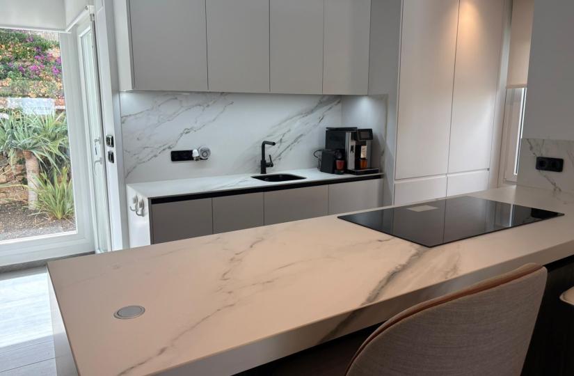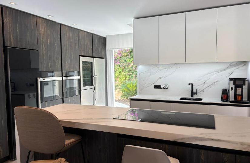 Beliggende på en generøs grund på 500 m², tilbyder dette moderne hjem en perfekt blanding af elegance og komfort. Ejendommen har en rummelig, lys opholdsstue suppleret af et fuldt udstyret luksuskøkken, to stilfulde badeværelser med gulvvarme og to soveværelser, med et alsidigt tredje værelse, der kan fungere som omklædningsrum eller kontor. Udenfor kan du nyde den smukt anlagte have, en vestvendt terrasse med indbygget grill og en privat pool med brede trin, ideel til afslapning under den spanske sol.
