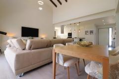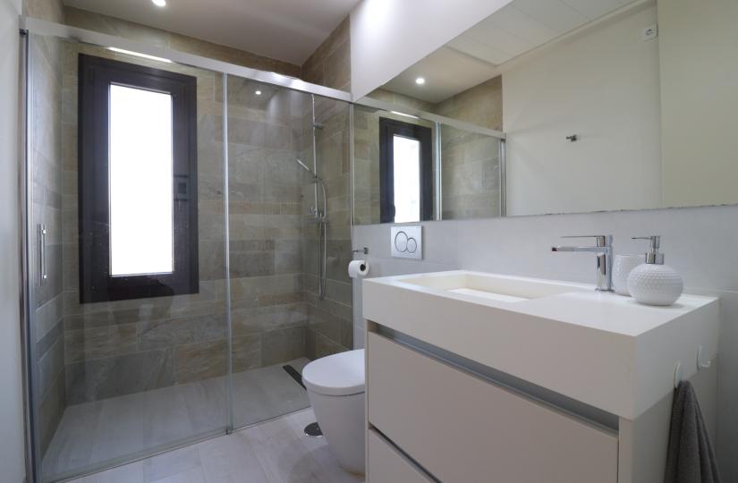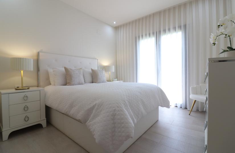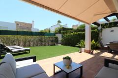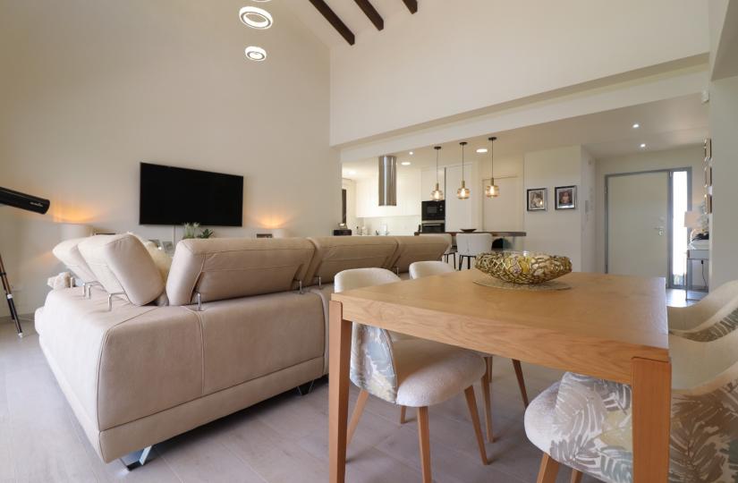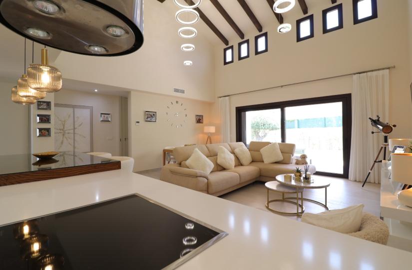 Wybudowany w 2017 roku, ten nowoczesny dom o powierzchni 127 m² oferuje jasny i przestronny salon z otwartą przestrzenią, sklepionym sufitem z belkami stropowymi i dużymi przesuwanymi drzwiami, które wypełniają przestrzeń naturalnym światłem. Elegancka kuchnia wyposażona jest w barek śniadaniowy i osobne pomieszczenie gospodarcze, idealne do komfortowego życia. Wszystkie trzy sypialnie dwuosobowe wyposażone są w wbudowane szafy, w tym sypialnia główna z wyjściem na prywatny taras i łazienką z prysznicem. Na przestronnej, łatwej w utrzymaniu działce o powierzchni 448 m² znajduje się częściowo zadaszony taras, sztuczna trawa, miejsce parkingowe z wiatą samochodową oraz dostęp do dwóch wspólnych basenów.