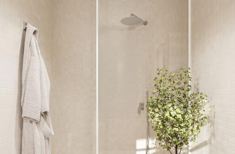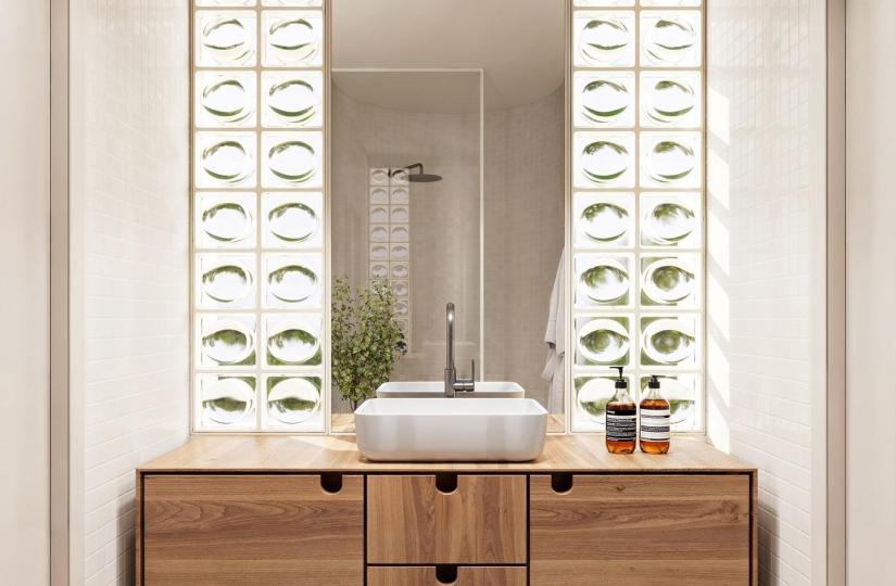 Baños con calefaccion por suelo radiante, muebles empotrados con espejos y mamparas de ducha.