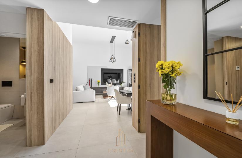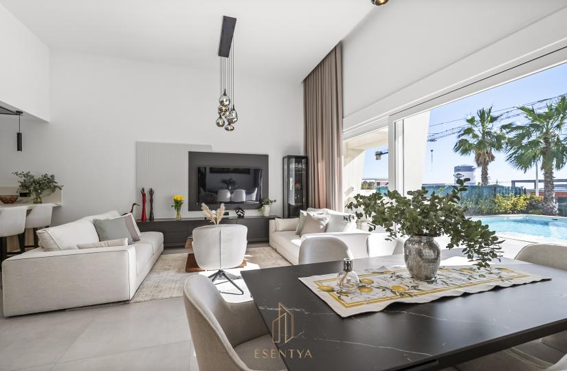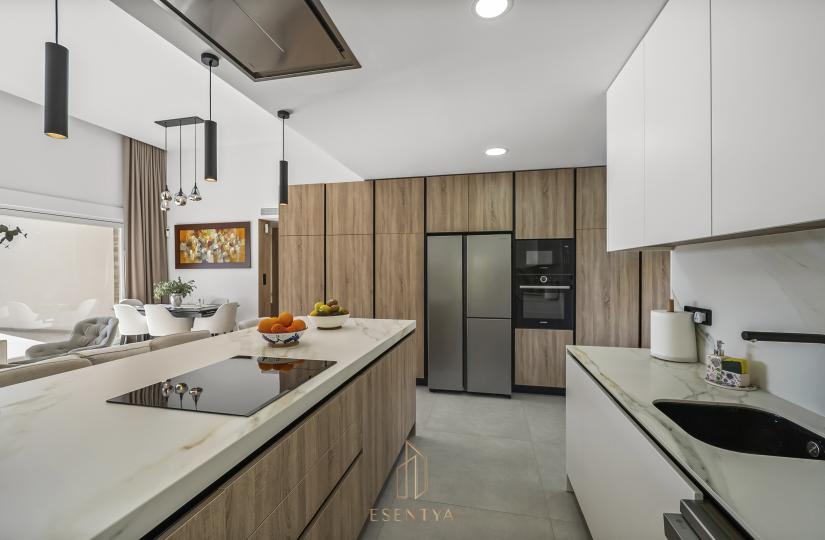 Built in 2024, this contemporary detached property offers a spacious, single-level design with a generous 313 m² of living space on a beautifully landscaped 458 m² plot with southeast orientation. The villa features a bright, open-plan living room with a double-height ceiling, a fully equipped Bosch kitchen, and four elegant bedrooms each with its own bathroom, providing comfort and privacy.