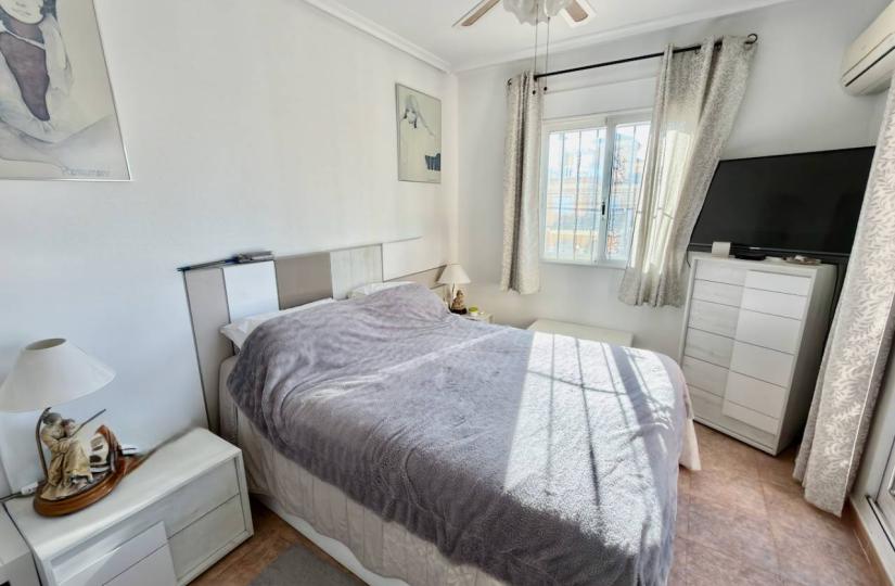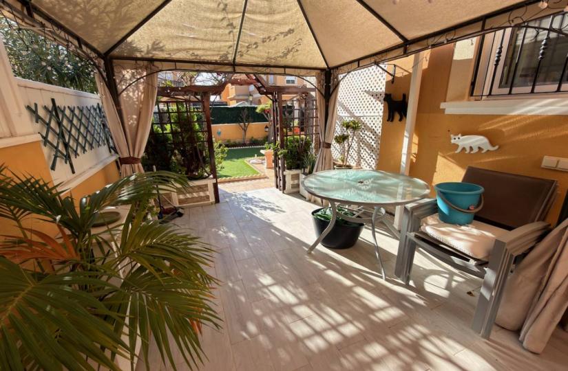 Construite en 2004 et méticuleusement entretenue, cette propriété entièrement meublée dispose d'un intérieur lumineux et spacieux de 100 m² sur un terrain généreux de 200 m² bénéficiant d'une orientation sud-ouest idéale, garantissant une luminosité naturelle optimale. Le séjour/salle à manger ouvert est complété par une cuisine entièrement équipée avec électroménager, climatisation et ventilateurs de plafond, créant une atmosphère chaleureuse en toute saison. Chaque chambre est dotée de placards intégrés offrant un espace de rangement généreux. À l'extérieur, vous profiterez d'un jardin privatif avec une vue agréable, d'un abri de jardin et d'un parking privé avec portail électrique pour plus de sécurité. La propriété bénéficie également d'un magnifique solarium, idéal pour bronzer ou se détendre sous le soleil espagnol. Les résidents ont accès à une piscine commune bien entretenue, parfaite pour se rafraîchir lors des chaudes journées d'été.