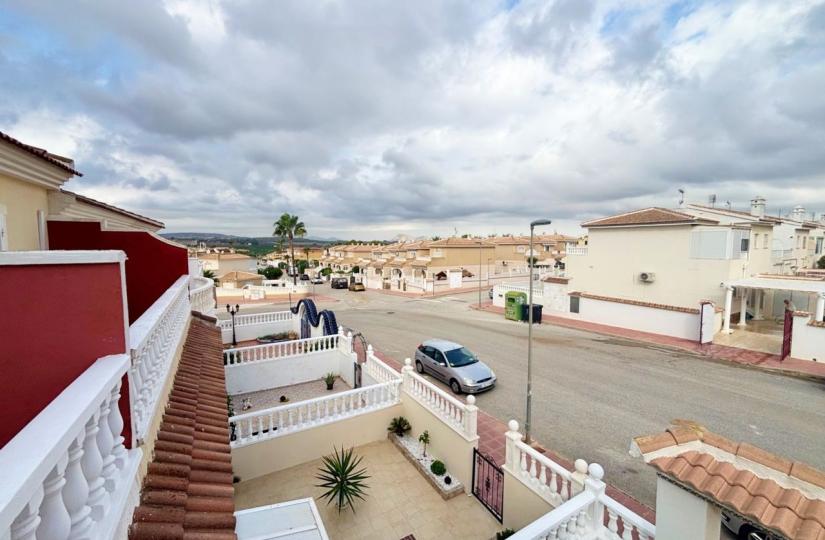 La propriété, bien entretenue, offre une atmosphère lumineuse et chaleureuse sur ses 101 m², avec notamment une terrasse avant couverte et des rideaux de verre. Le rez-de-chaussée comprend un spacieux salon, une salle à manger séparée et une cuisine équipée avec accès à l'arrière. On trouve également une chambre double et une salle de douche à ce niveau. À l'étage, la chambre principale et une deuxième chambre double, toutes deux équipées de ventilateurs de plafond, partagent une salle de bain familiale, la chambre principale donnant sur une terrasse couverte. À l'extérieur, le jardin avant facile d'entretien ajoute à l'attrait de la propriété. Les autres caractéristiques comprennent la climatisation, des placards, une cheminée et une terrasse vitrée. Les résidents bénéficient également d'un accès à une piscine et des jardins communs à quelques pas. La propriété bénéficie d'un emplacement calme au sein de l'urbanisation, à proximité de terrains de golf comme La Finca et La Marquesa, et à environ 15 minutes des belles plages de la Costa Blanca Sud.