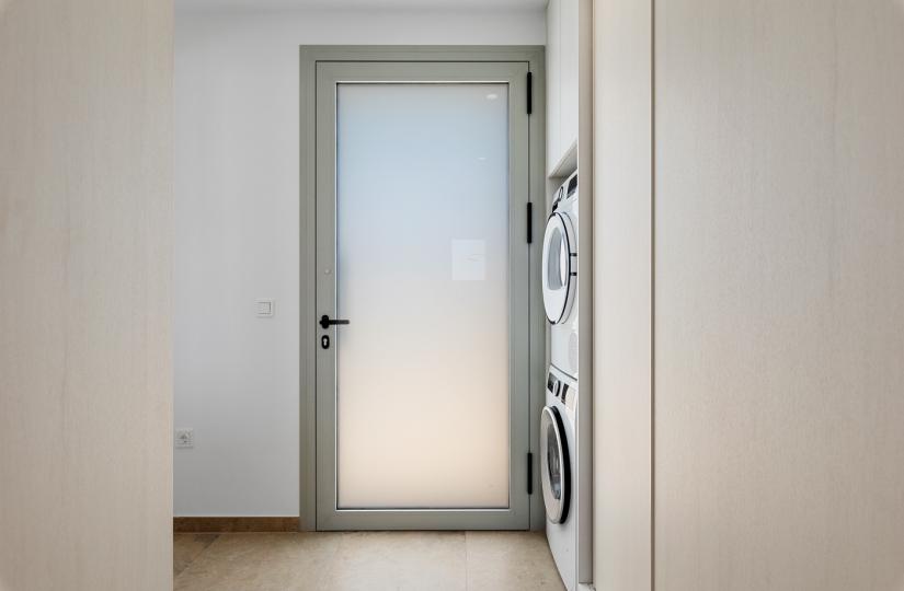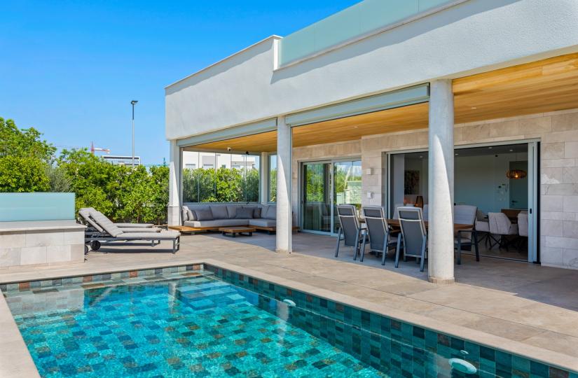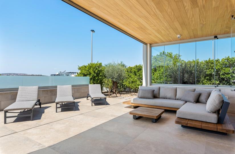 This modern property offers a spacious 475 square meters of elegant design on a 495-square-meter southwest-facing plot. The open-concept layout seamlessly blends indoor comfort with outdoor living, featuring large glass doors that provide direct access to a private swimming pool. The ground floor includes a generous bedroom with built-in wardrobes and an en suite bathroom, while the upper level hosts three additional bedrooms, two with en suites, and a magnificent solarium with panoramic views—ideal for relaxing or entertaining. The expansive basement presents versatile space that can be transformed into a garage, entertainment zone, or guest suite, adding to the property's functionality.