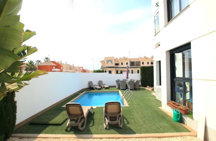 The property features a private swimming pool, off-road parking, and numerous sunny and shaded areas perfect for relaxing or entertaining. Inside, the ground floor boasts a spacious lounge-diner, a designer kitchen with ample storage, a double bedroom, and a family bathroom. Upstairs, you'll find three additional bedrooms, each with their own en-suite bathroom, providing plenty of space for family or guests. The large 60sqm sun-drenched solarium offers stunning views over the development and towards the nearby salt lake, making it an ideal spot for enjoying Alicante's beautiful climate.