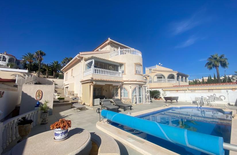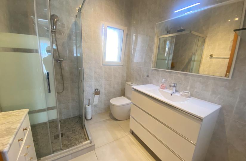 Le niveau inférieur abrite un appartement entièrement indépendant avec salon, cuisine-salle à manger, chambre double et salle de bains, idéal pour accueillir des invités ou la famille. À l'extérieur, vous profiterez d'une grande piscine privée et d'une terrasse agrémentée d'une paroi partiellement vitrée, de chaises longues, de tables et d'un espace jeux avec billard. Un coin salon couvert et accueillant, situé sous la terrasse du niveau intermédiaire, offre un cadre parfait pour vos soirées. La villa est dotée de nombreux équipements, dont la climatisation, le chauffage au sol dans les salles de bains, des panneaux solaires, un système de filtration d'eau et une piscine chauffée.