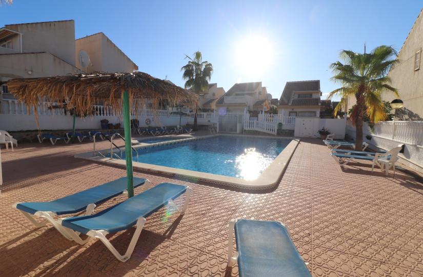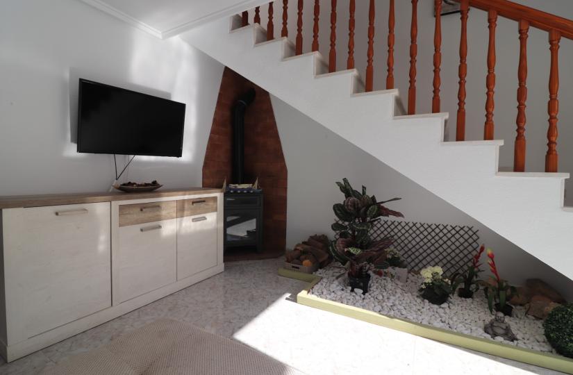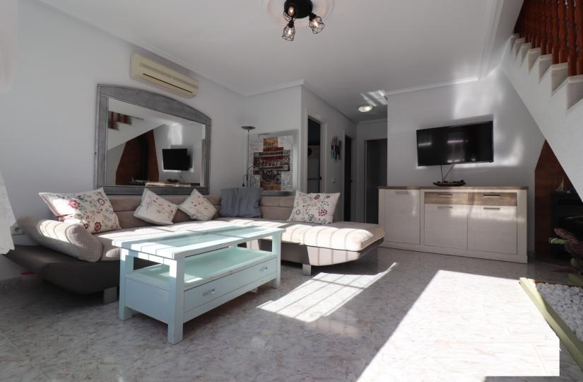 Located in a highly desirable area on the Costa Blanca South, it is just a five-minute walk to local shops, three minutes by car to supermarkets, and only eight minutes drive to stunning beaches. The property features a fully fitted separate kitchen and a bright, airy lounge with air conditioning and a cozy log burner, making it comfortable all year round. The master bedroom, situated on the first floor, benefits from an en suite shower room and patio doors that open onto a private solarium, perfect for relaxing and enjoying the sunshine. The two additional double bedrooms on the ground floor have fitted wardrobes and air conditioning, along with a family bathroom. Outside, there is off-road parking, a storage shed, and a private solarium ideal for sunbathing or outdoor dining. The villa also benefits from access to a communal pool, a garden, terrace, and additional storage space.