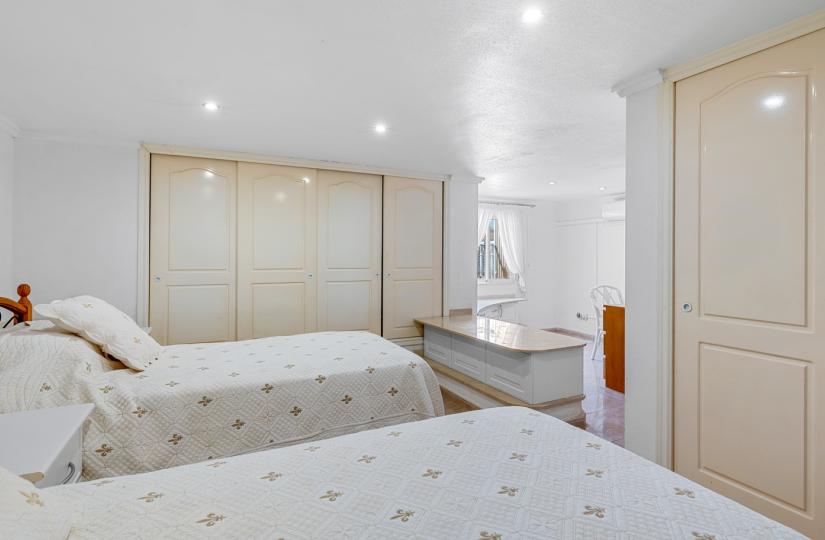 The top floor serves as a semi-independent guest suite with additional bedrooms, a kitchen, living spaces, and a covered terrace—ideal for extended family or guests. Outdoor amenities include a private pool, pergola-covered seating areas, and spacious terraces for relaxation and entertaining. Additional features such as air conditioning, built-in wardrobes, a garage, and a detached storage room enhance the property's appeal. Perfect for families or multigenerational living, this east-facing villa combines comfort, functionality, and tranquility just minutes from local shops, restaurants, and amenities.