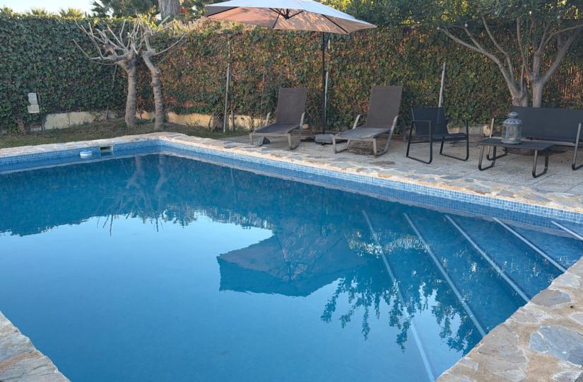 Położony na przestronnej działce o powierzchni około 1000 m², ten parterowy dom łączy nowoczesny luksus z komfortem. Wewnątrz znajdziesz nowoczesną kuchnię połączoną z jasnym salonem, trzy przestronne sypialnie i dwie pięknie odnowione łazienki. Meble mogą być dołączone na życzenie, co ułatwi Ci przeprowadzkę. Wyjdź na zewnątrz, aby cieszyć się urokliwym patio o powierzchni 11 m² lub organizować spotkania w dużej, w pełni wyposażonej kuchni zewnętrznej o wymiarach około 10 na 5 metrów. Słoneczny ogród szczyci się prywatnym, zachęcającym basenem, idealnym do relaksu lub spotkań towarzyskich w całkowitej prywatności. Dodatkowe udogodnienia obejmują praktyczne schowki i przestronny garaż na dwa samochody.