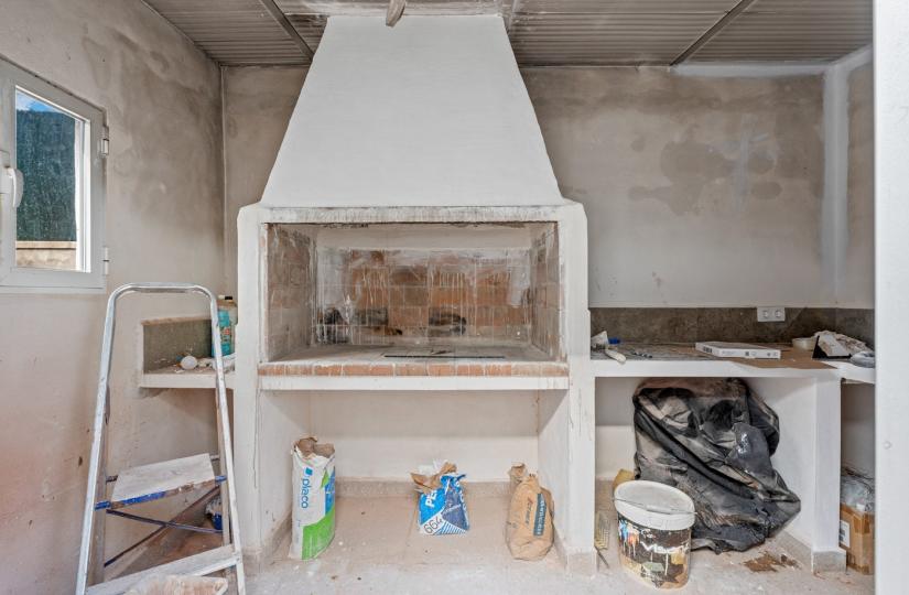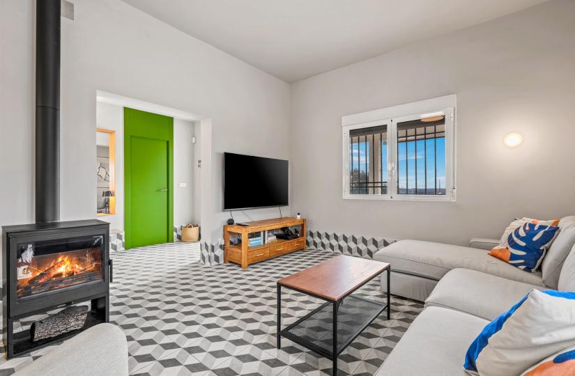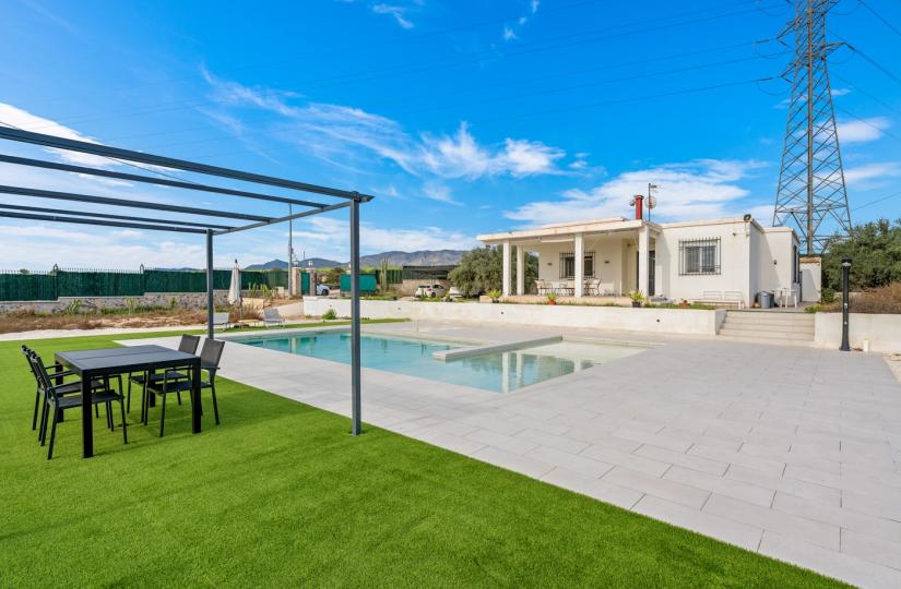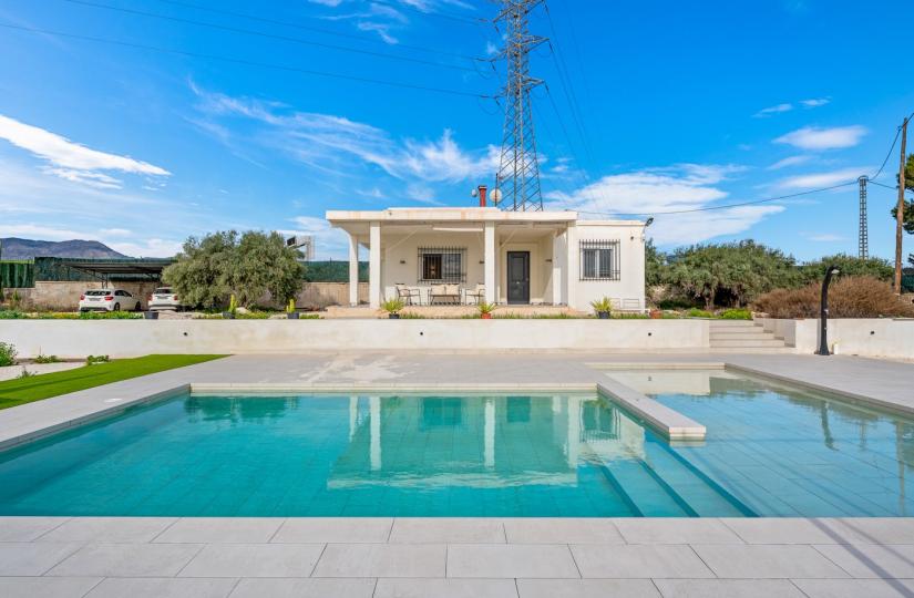 Det etplanshus, bygget i 1980 og renoveret for fire år siden, har tre soveværelser og tre badeværelser, med en generøs stue med pejs og et stort køkken. Udenfor kan du nyde en dejlig terrasse, en stor have og en helt ny swimmingpool på 10x8 meter. Der er også en grill under opførelse og et separat toilet, perfekt til udendørs underholdning. Ejendommen er udstyret med vand til kunstvanding, et filtreringssystem til husholdningsbrug, en privat brønd, lovlig elektricitet og en septiktank. Yderligere faciliteter inkluderer aircondition, garage, parkering på grunden og sydvendt beliggenhed.