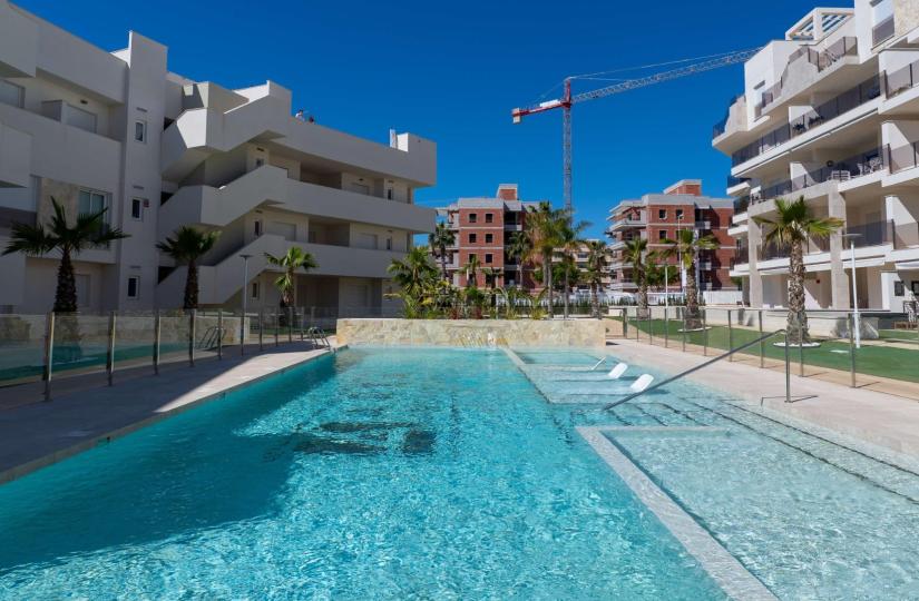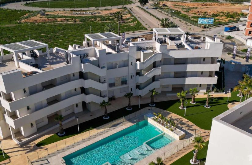 Vackra bostadskomplex, inklusive en glasad GYM-Spa-avdelning med utsikt over gronområden, simbassanger och från sin terrass med utsikt over saltlagunen La Mata, paddeltennisbana osv.