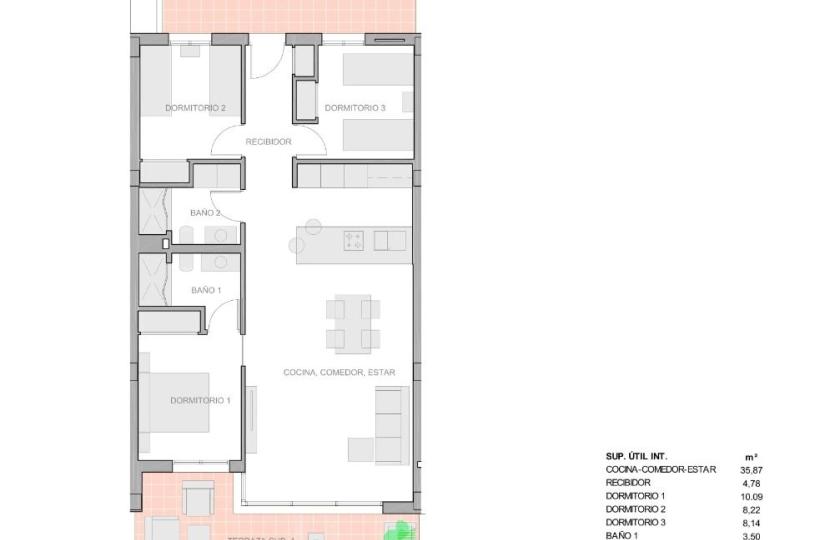Deze appartementen hebben 3 slaapkamers, 2 badkamers, open salon met keuken, begane grond met prive tuin, middelste verdieping met terras en bovenste verdieping met prive solarium.