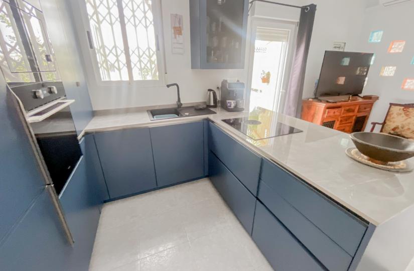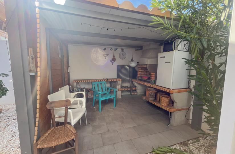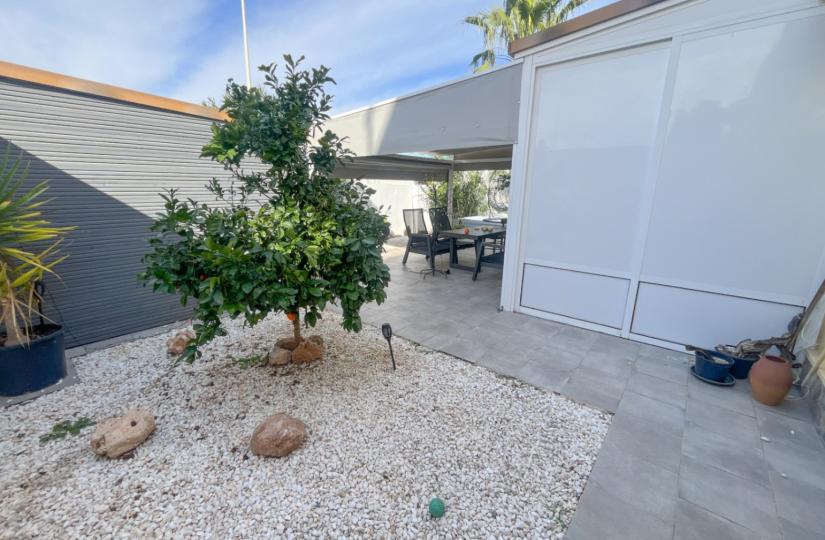 Innvendig tilbyr bungalowen to soverom og et moderne bad, nylig oppdatert med et elegant nytt kjøkken som inkluderer et integrert drikkevannsfilter og et oppvarmet håndklestativ på badet. De glasserte terrassene foran og på siden gir allsidig plass for bruk året rundt. Komforten forbedres av klimaanlegg, takvifter og praktiske oppbevaringsmuligheter, inkludert et skur, utendørs skap og en underjordisk parkeringsplass i nærheten.