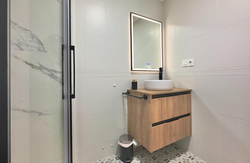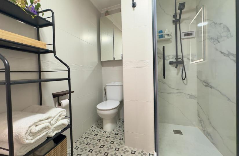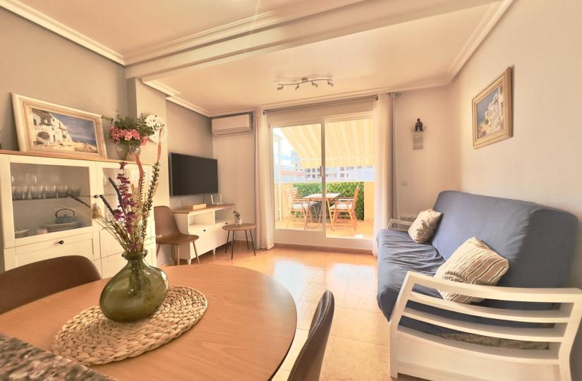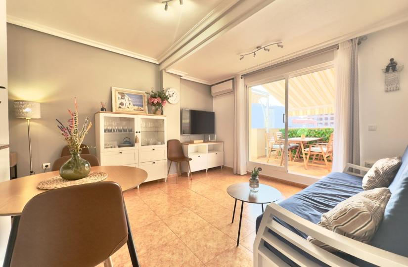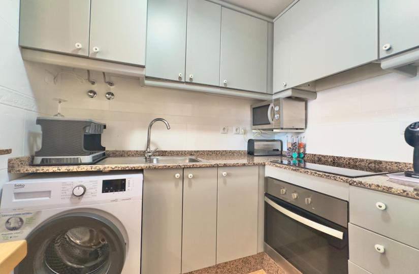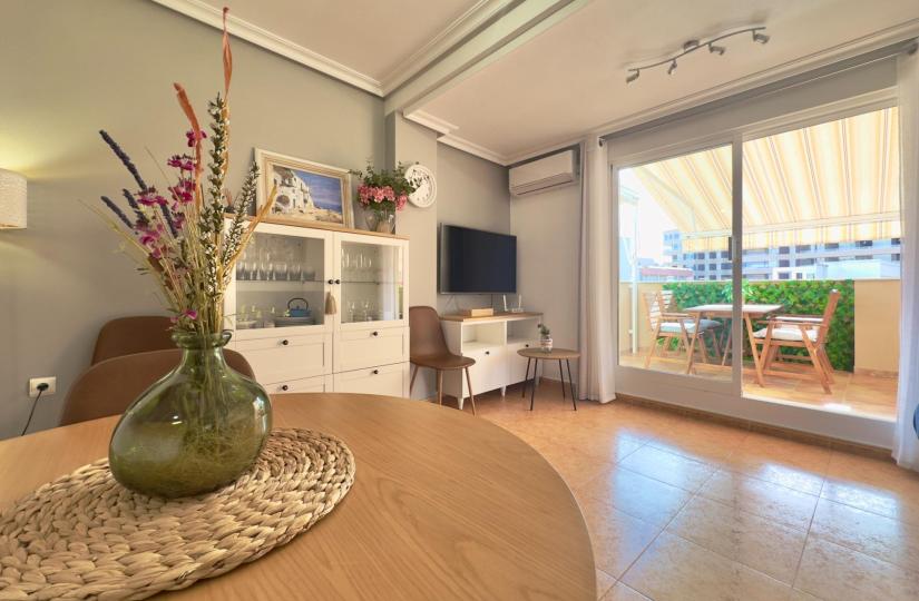 Inside, you'll find two bedrooms and a fully renovated bathroom, all integrated into a modern, open-plan kitchen that maximizes space and functionality. Additional features include a communal storage room, access to a small rooftop terrace with sea views for peaceful moments, and amenities like air conditioning, an armored door, and appliances. Conveniently located only 150 meters from the beach and close to Plaza Encarnación Pujol, this property is surrounded by shops, restaurants, and transport, making it perfect as a primary residence, a holiday retreat, or an investment opportunity.