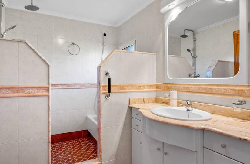 Nestled on a generous 955 m² plot, the property boasts a spacious, air-conditioned open-plan lounge, kitchen, and dining area, perfect for comfortable living and entertaining. The four bedrooms feature built-in wardrobes, while the three bathrooms, including a master en-suite, offer convenience and privacy. Step outside to enjoy the 57m² private pool, sunbathing terraces, shaded relaxation zones, and beautifully maintained outdoor spaces. The villa and its grounds are in impeccable condition, meticulously cared for by the current owner. Located in a prime spot, it provides easy walking access to a full range of amenities and is well-connected by public transport. Sold furnished, the property comes equipped with air conditioning, double glazing, security shutters, grills, ceiling fans, and ample storage. With an active tourist license, it has proven to be a successful holiday rental. Built in 1988, this southwest-facing home combines comfort, style, and investment potential in a highly desirable location.
