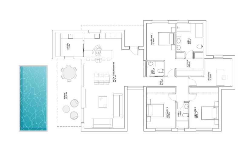 Zona de dia: Donde encontramos un amplio salon comedor con cocina abierta tipo office (muebles de cocina incluidos) que conecta con el amplio y moderno porche a traves de sus dos grandes ventanales, dando paso a la zona exterior ajardinada y por que no... a la piscina. La luz inunda cada rincon gracias a los grandes ventanales del salon, que se abren al porche, un espacio moderno y funcional que invita a disfrutar al maximo del aire libre. Imagina pasar las tardes con la familia y los amigos, rodeado de un entorno sereno y natural. Como espacio extra, cuenta con una zona de lavanderia estrategicamente situada en la distribucion de la vivienda donde sera muy facilmente accesible desde cualquier punto de la casa.