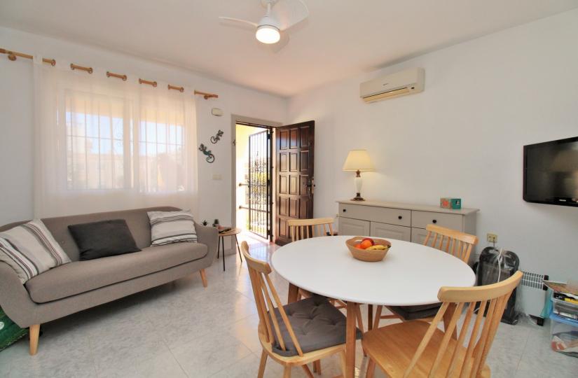 Featuring two bedrooms and one modern bathroom, this furnished property offers a bright living and dining area, a separate fitted kitchen with utility space, and a sunny corner garden accessible from the master bedroom. The raised front terrace overlooks the communal pool, ideal for relaxing or outdoor dining. With air conditioning, ceiling fans, fitted wardrobes, and a spacious private garden, it’s ready for comfortable living or holiday enjoyment. Surrounded by beautifully maintained gardens and multiple swimming pools, the apartment is just a short walk to local amenities, the renowned Villamartin Plaza and Golf Course, and only an eight-minute drive to stunning beaches and Zenia Boulevard shopping mall.