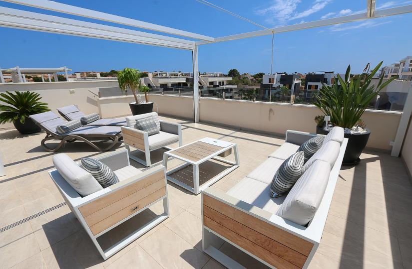 Denna nybyggda, elegant inredda fastighet har två sovrum och två badrum inom en boyta på cirka 71 kvadratmeter med väldesignade utrymmen. Det ljusa vardagsrummet ansluter sömlöst till ett öppet kök och en solig balkong, perfekt för avkoppling eller underhållning. Inuti inkluderar moderna bekvämligheter luftkonditionering med individuell klimatkontroll, och lägenheten är delvis möblerad med smakfulla möbler och accessoarer. Höjdpunkten är det stora takterrassen, nästan 80 kvadratmeter, komplett med en privat jacuzzi, pergolor och panoramautsikt – perfekt för att njuta av Costa Blancas solsken i avskildhet. De boende har också tillgång till en gemensam pool, gym och bastu, vilket förstärker den lyxiga livsstilen.