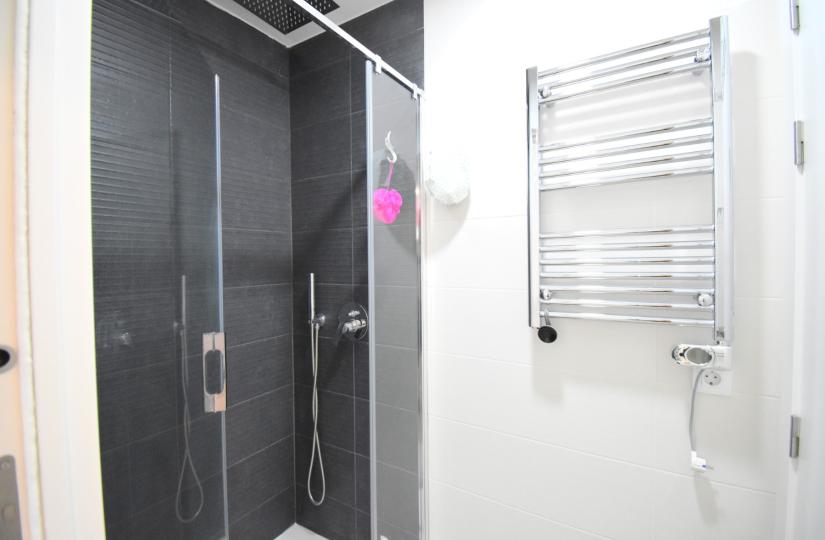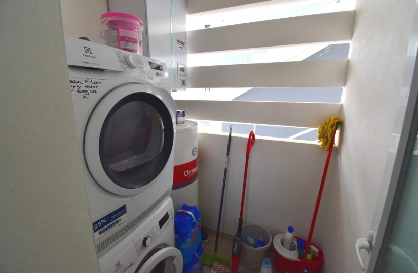 L'appartement est moderne, lumineux et ouvert. Il comprend un spacieux salon-salle à manger avec de grandes portes-fenêtres coulissantes à double vitrage donnant sur la terrasse, l'endroit idéal pour se détendre ou dîner en plein air. L'élégante cuisine blanche équipée comprend un bar et un accès à une buanderie séparée.