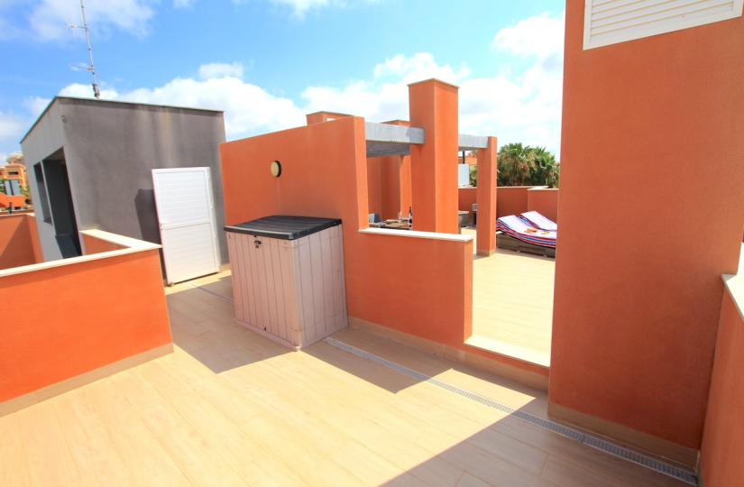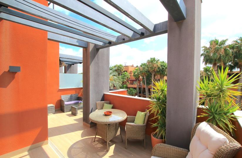 Een hoogtepunt is het privé dakterras, dat baadt in de zon en een prachtig uitzicht biedt op de omliggende golfbaan en de Middellandse Zee. Hoewel de wenteltrap die het zonneterras met het solarium verbindt is verwijderd, kan deze eenvoudig worden hersteld op kosten van de nieuwe eigenaar. Het ruime solarium is voorzien van nutsvoorzieningen, klaar voor een zomerkeuken of jacuzzi, en biedt een ideale plek om te ontspannen.