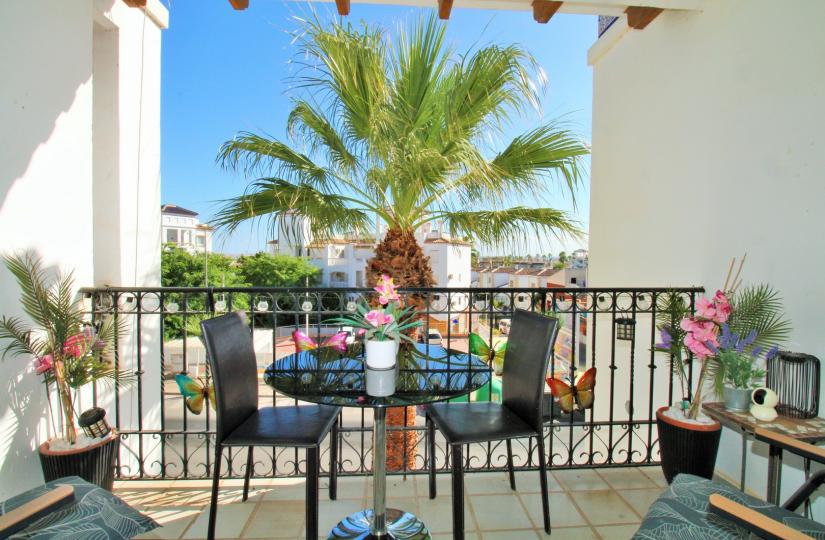 Belägen i ett säkert gated community utan grannar på övervåningen, erbjuder den extra avskildhet och en lugn atmosfär. Det ljusa vardagsrummet/matsalen har franska dörrar som öppnar upp mot en privat balkong med härlig havsutsikt, perfekt för avkoppling eller underhållning. Intill vardagsrummet finns ett separat kök med ett angränsande tvättutrymme, medan baksidan av lägenheten har ett rymligt sovrum med dubbelsäng, inbyggda garderober och ett generöst badrum.