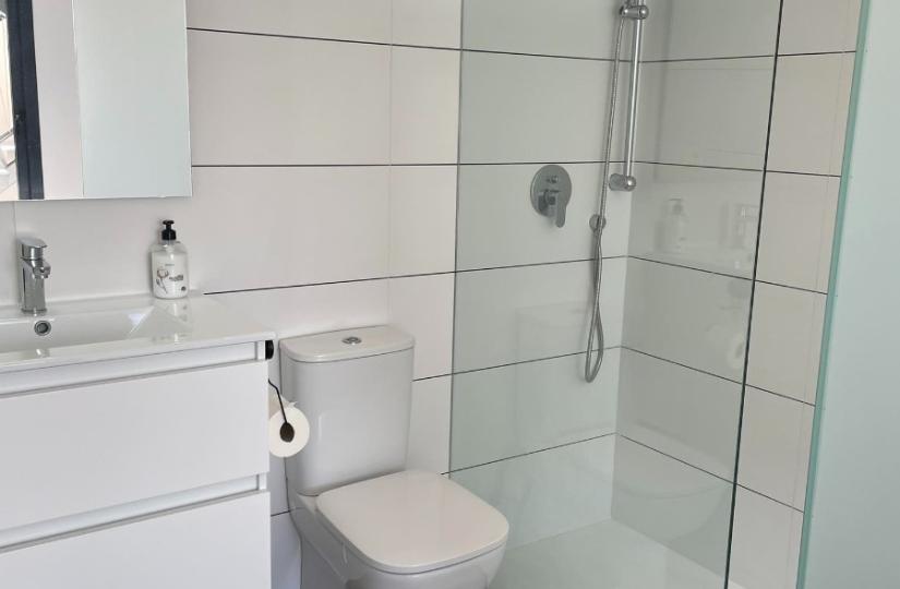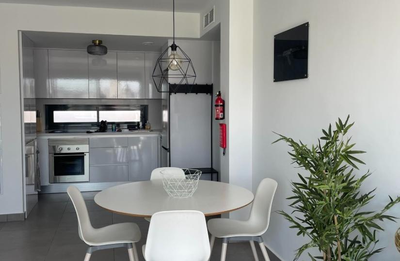 Step inside to find an open-plan American kitchen fully equipped with all necessary appliances, seamlessly connected to a welcoming living space. The apartment’s large windows and terrace provide stunning views of the lush communal gardens and inviting swimming pool, creating a tranquil backdrop for everyday life. The spacious terrace and expansive solarium, furnished with an aluminum lounge set, sun loungers, and a canvas pergola, offer the perfect outdoor oasis for sunbathing, entertaining, or simply unwinding under the warm Costa Blanca sun.