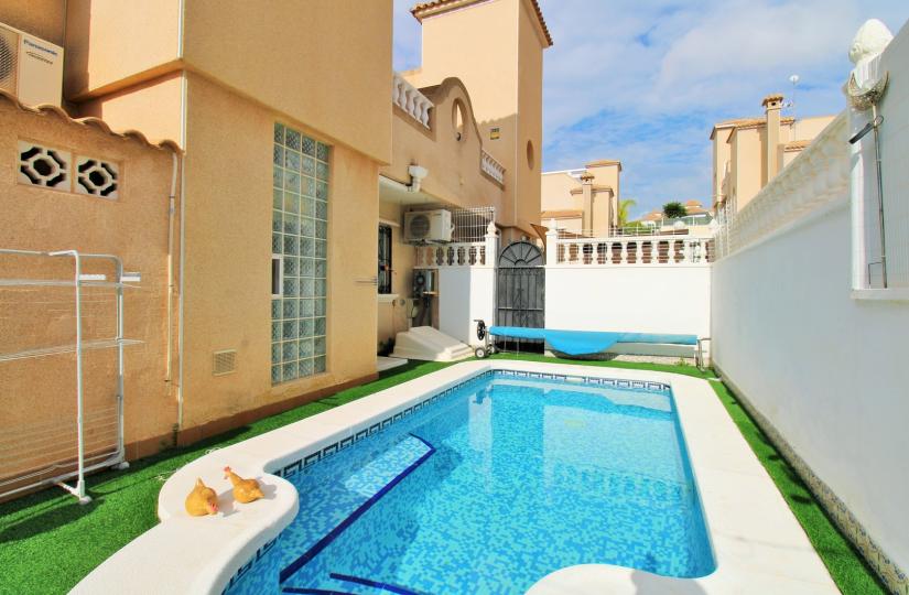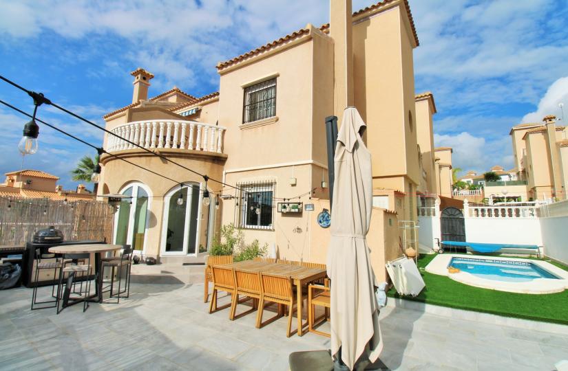 Denne boligen ligger i det eksklusive Zodiaco V-samfunnet, og har blitt modernisert til en høy standard, med nytt gulv, et moderne kjøkken, stilige bad, oppgradert elektrisk anlegg og frisk belysning overalt. Den ligger på en generøs privat tomt, og tilbyr en romslig flislagt terrasse, et privat svømmebasseng med oppvarmet boblebad, perfekt for avslapning og underholdning året rundt.