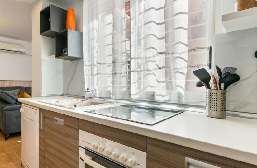 Built in 2003, the 55 m² property is ideally located close to local schools, a sports centre, a variety of restaurants, shops, bars, bus stops, and a medical centre, making it perfect for easy daily living. The apartment features a bright living and dining area that opens onto a balcony, which is accessible via stairs leading up to a spacious solarium with stunning views of Alicante and the sea. The south-facing orientation ensures abundant sunlight throughout the year. The kitchen is equipped with a hob, oven, washing machine, and fridge-freezer, while both bedrooms boast built-in wardrobes.