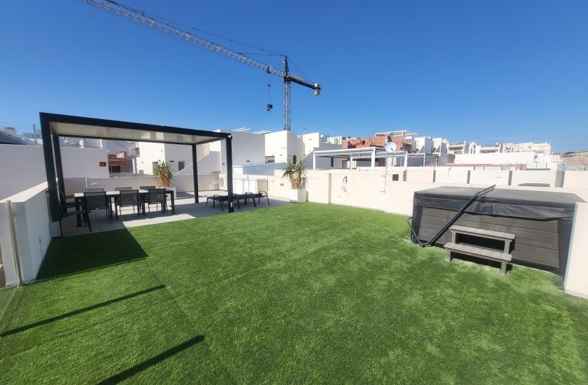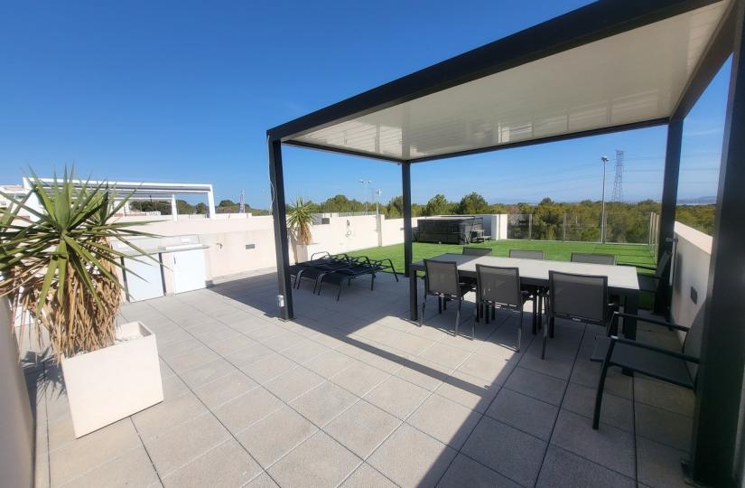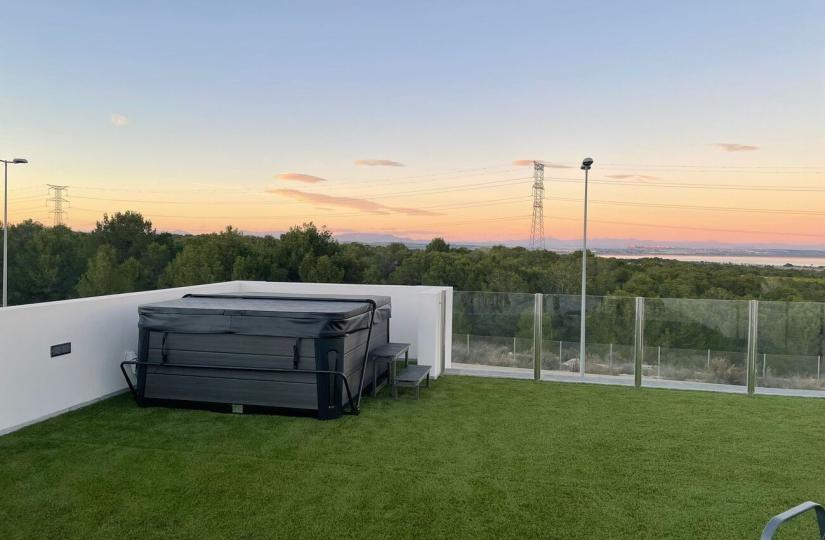 Eiendommen er designet som et smart hjem, og inkluderer sofistikert automatiseringsteknologi for forbedret sikkerhet, energieffektivitet og enkel administrasjon. Utendørs kan du nyte ditt eget private svømmebasseng og en generøs 104 m² stor solarium med utekjøkken, markise, spa og fantastisk utsikt over saltsjøene i Torrevieja. Uteområdet er vakkert anlagt med planter og har fasiliteter som en ekstern bod, alarmsystem, sikkerhetskameraer og Wi-Fi-tilgang på solariet. Hvert rom har individuelt klimaanlegg, noe som sikrer komfort året rundt.