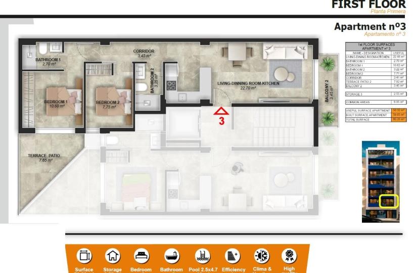Het gebouw biedt een keuze uit studio's, appartementen met 1 en 2 slaapkamers en penthouses met ruime priveterrassen. Alle woningen hebben een berging op de begane grond en toegang tot moderne gemeenschappelijke voorzieningen die het comfort en de levensstijl naar een hoger niveau tillen.
