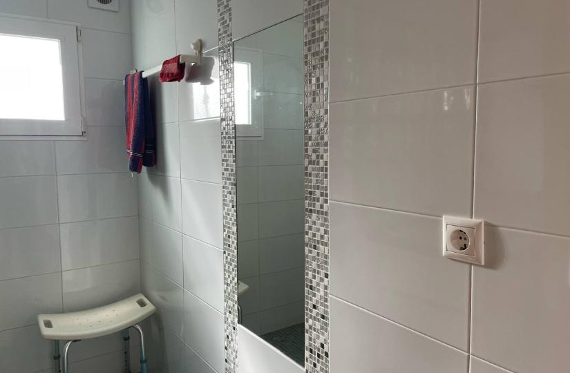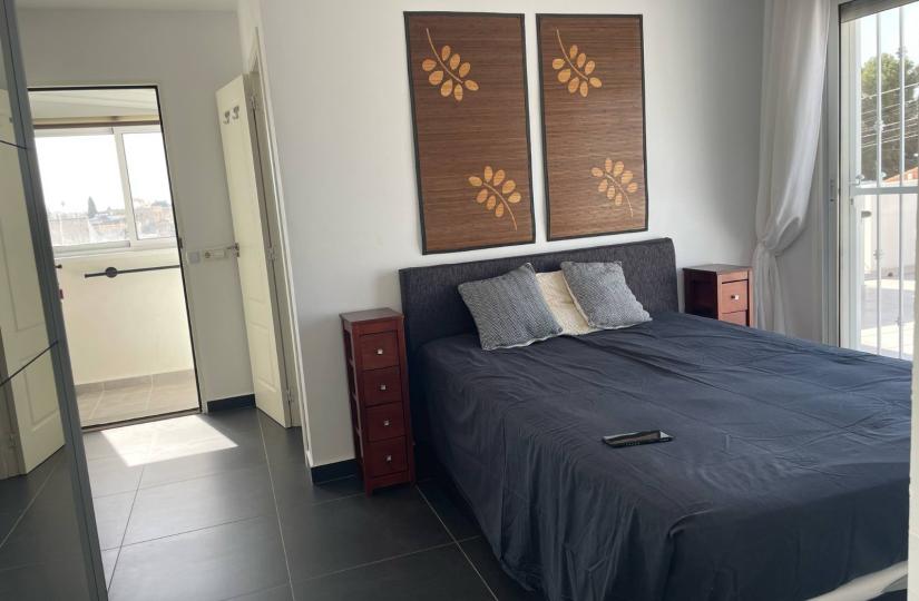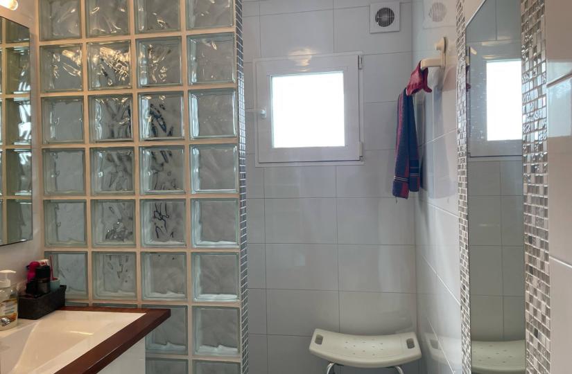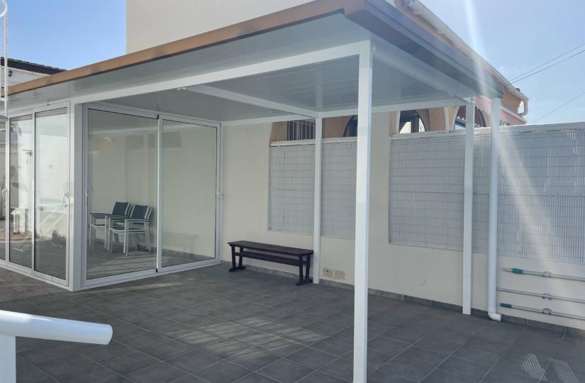 The home features a practical layout with two bedrooms and a bathroom on the main floor, all furnished and equipped with air conditioning for comfort. Beneath, a spacious basement houses a second bathroom and two large multipurpose rooms, offering versatile space for leisure, work or storage. Outside, enjoy a front patio, a partly covered private terrace and a barbecue area, along with a private 40 m² solarium accessible via the kitchen staircase, oriented southwest for ample sun exposure. The property also includes off-road parking, a communal pool, fitted wardrobes, ceiling fans and is ready to move into.